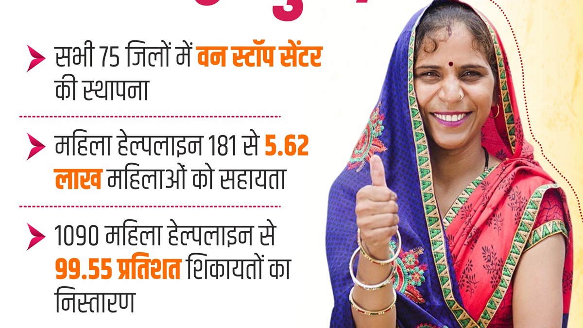 प्रदेश में महिला हेल्पलाइन 181 को जारी किया गया है। जिसकी मदद से प्रदेश में 5.62 लाख महिलाओं की सहायता की गई है। प्रदेश के सभी 75 जिलों में वन स्टॉप सेंटर की स्थापना की गई है। प्रदेश में 1090 महिला हेल्पलाइन से 99.55 प्रतिशत शिकायतों का निपटारा किया गया है।