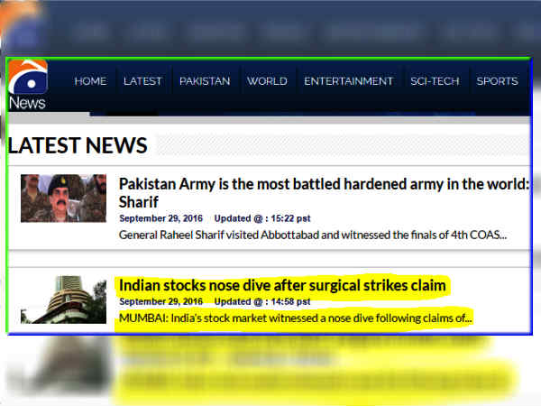 पाकिस्तानी न्यूज पोर्टल ने हेडिंग दी है, " Indian Stoks Nose Dive After Surgical Claim" इसके बाद पाकिस्तानी वेब पोर्टल जियो न्यूज ने सेंसेक्स में आई गिरावट का जिक्र किया और बड़े जोर शोर से इस खबर को दिखाया।