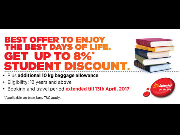 इस नवंबर में विमान कंपनी स्पाइस जेट लोगों के लिए कुछ आकर्षक ऑफर लेकर आई है। तो आप भी तैयार हो जाइए इन ऑफर्स का लाभ उठाने के लिए। अब स्पाइस जेट आपको एक्सट्रा 10 किलो बैगेज ले जाने का ऑफर दे रहा है। ये एक्सट्रा बैगेज ऑफर सिर्फ और सिर्फ स्टूडेंट्स के लिए है इसलिए आप इसस संबंधित नियम और शर्तों को पहले ध्यान से पढ़ लें। स्पाइस जेट के ऑफर जानने के लिए यहां क्लिक करें।