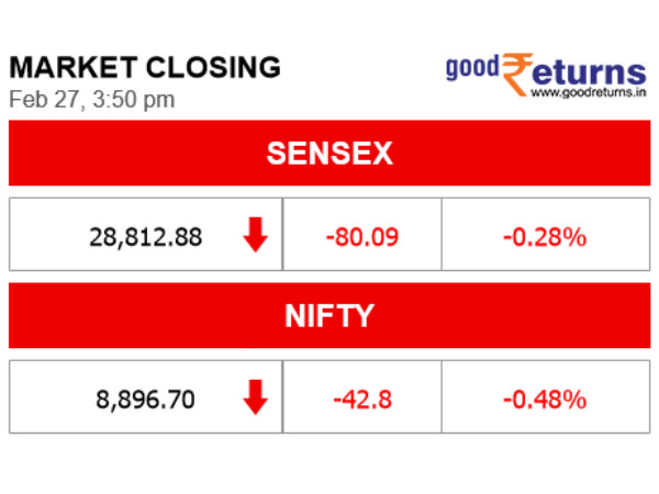 देश के शेयर बाजारों में सोमवार को गिरावट देखी गई। प्रमुख सूचकांक सेंसेक्स 80.09 अंकों की गिरावट के साथ 28,812.88 पर और निफ्टी 42.80 अंकों की गिरावट के साथ 8,896.70 पर बंद हुआ। बंबई स्टॉक एक्सचेंज (बीएसई) का 30 शेयरों पर आधारित संवेदी सूचकांक सेंसेक्स सुबह 17.53 अंकों की गिरावट के साथ 28910.50 पर खुला और 80.09 अंकों या 0.28 फीसदी की गिरावट के साथ 28,812.88 पर बंद हुआ। दिनभर के कारोबार में सेंसेक्स ने 28961.83 के ऊपरी और 28791.19 के निचले स्तर को छुआ।