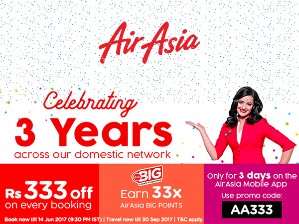 एयर एशिया के शानदार तीन साल पूरे हो चुके हैं। अपनी तीसरी सालगिरह मनाने के लिए एयर एशिया हर किसी को प्रत्येक बुकिंग पर 333 रुपये की छूट दे रहा है।