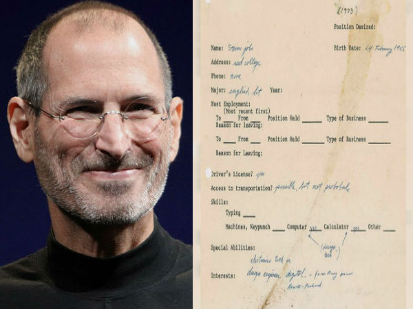 जॉब्स ने 1972 में एक पन्ने की प्रश्नावली भरी थी। इसमें उन्होंने अपना पता..रीड कॉलेज, फोन के कॉलम में 'कोई नहीं', विषय के कॉलम में ‘अंग्रेजी साहित्य' भरा था। इसके अलावा स्टीव जॉब्स ने मिडिल क्लास में ड्राइविंग लाइसेंस के बारे में पूछे गए सवाल के जवाब में ‘हां' लिखा था। उन्होंने अपने शैक्षणिक कौशल में स्टीव जॉब्स ने कम्प्युटर और कैलकुलेटर के कॉलम में ‘हां' लिखा था। उन्होंने नीचे अपनी विशेष योग्यता के तौर पर ‘इलेक्ट्रानिक्स टेक या डिजाइन इंजीनियर' लिखा है।
