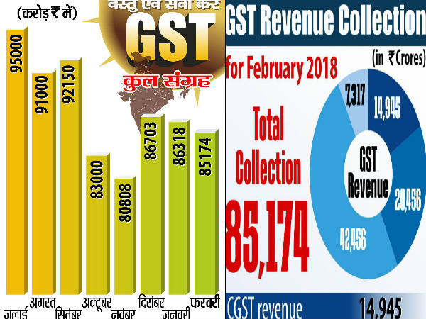 वित्त मंत्रालय ने एक बयान में कहा, "GST के तहत प्राप्त कुल राजस्व 2018 के फरवरी (26 मार्च तक प्राप्त) में 85,174 करोड़ रुपए रहा।" बयान में कहा गया है कि फरवरी के लिए 25 मार्च तक कुल 59.51 लाख रुपए का रिटर्न दाखिल किया गया है। बयान में कहा गया है, "कुल 69 फीसदी करदाताओं को मासिक रिटर्न दाखिल करने की जरूरत होती है।"