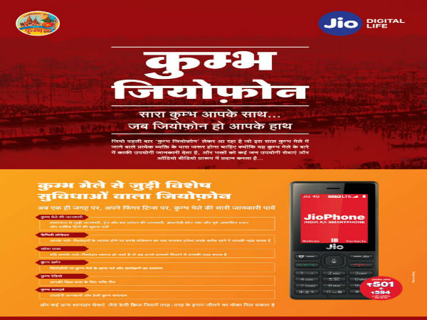 रिलायंस जियो ने प्रयागराज कुम्भ को लेकर 'कुम्भ जियोफोन' की पेशकश की है। जिसमें कुम्भ से जुड़ी हर छोटी-बड़ी जानकारी देने के लिए फीचर्स होंगे।