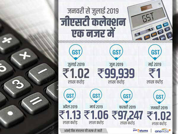 जुलाई 2019 में सेंट्रल जीएसटी कलेक्शन 17,912 करोड़ रुपये रहा है। वहीं स्टेट जीएसटी कलेक्शन 25,008 करोड़ रुपये का हुआ। इंटीग्रेटेड जीएसटी 50,612 करोड़ रुपये रहा है और सेस कलेक्शन 8,551 करोड़ रुपये रहा। इसमें से आयात से मिला 797 करोड़ रुपये का सेस भी शामिल है। इसके अलावा जुलाई में 75.79 लाख जीएसटीआर 3बी रिटर्न जमा कराए हैं। सरकार की तरफ से जारी बयान के अनुसार राज्यों को जीएसटी से होने वाले नुकसान की भरपाई के रूप में अप्रैल से मई के बीच 17,789 करोड़ रुपये जारी किया गया है।